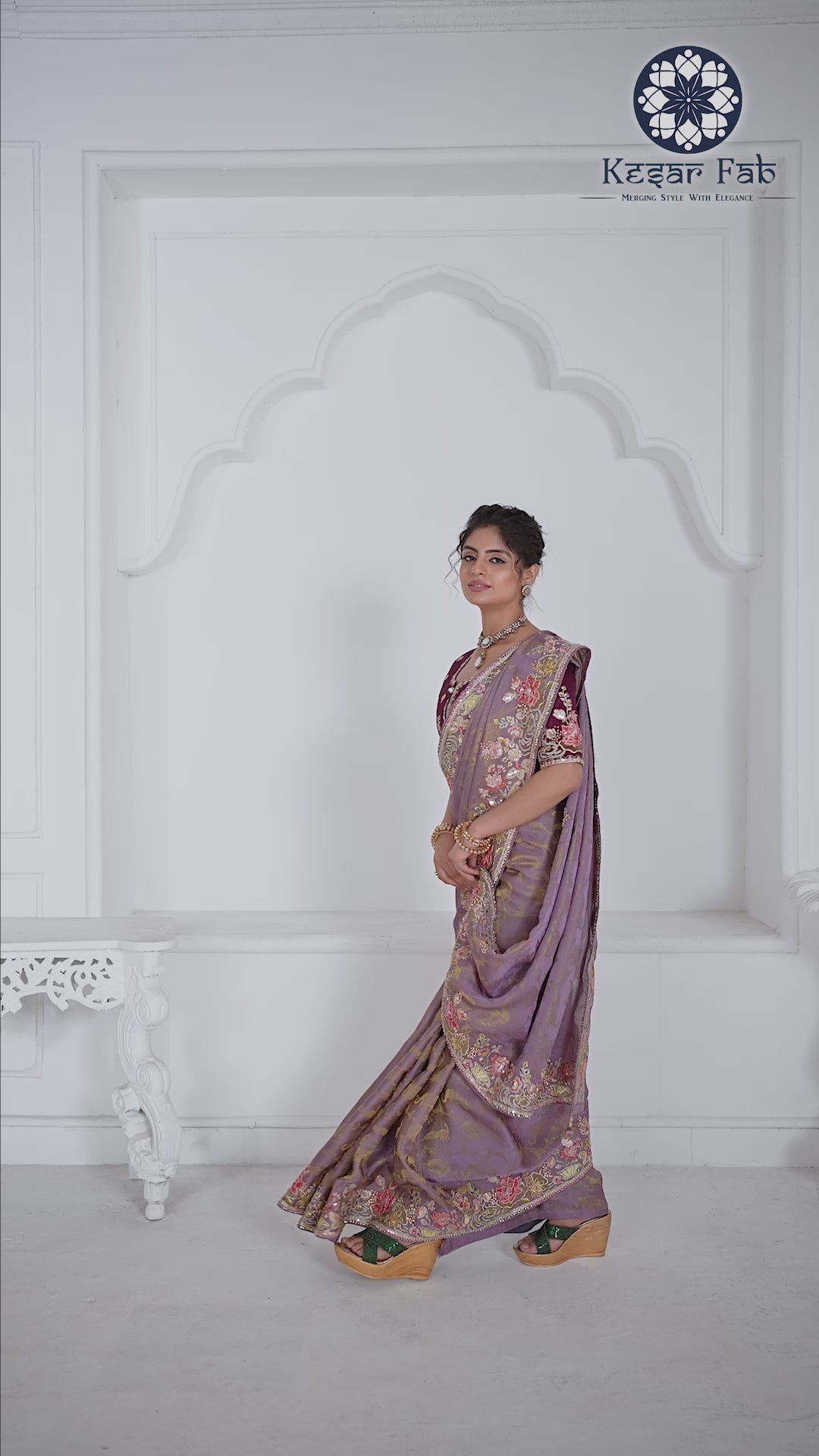Blushing Mauve: Multi-Thread Embroidered Saree with Floral Elegance