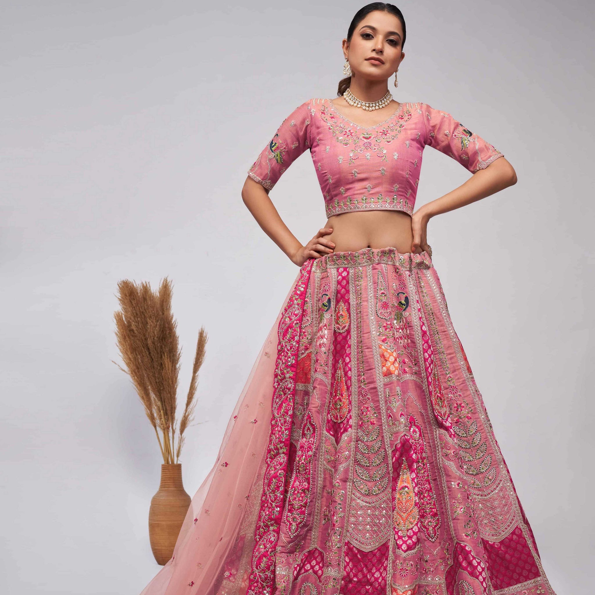 Unveil your bridal elegance with Kesar Fab's luxurious Pink Organza Silk Lehenga – a tribute to timeless tradition and modern finesse. Designed for the bride who cherishes classic detailing, this ensemble radiates charm through intricate embroidery and graceful textures.